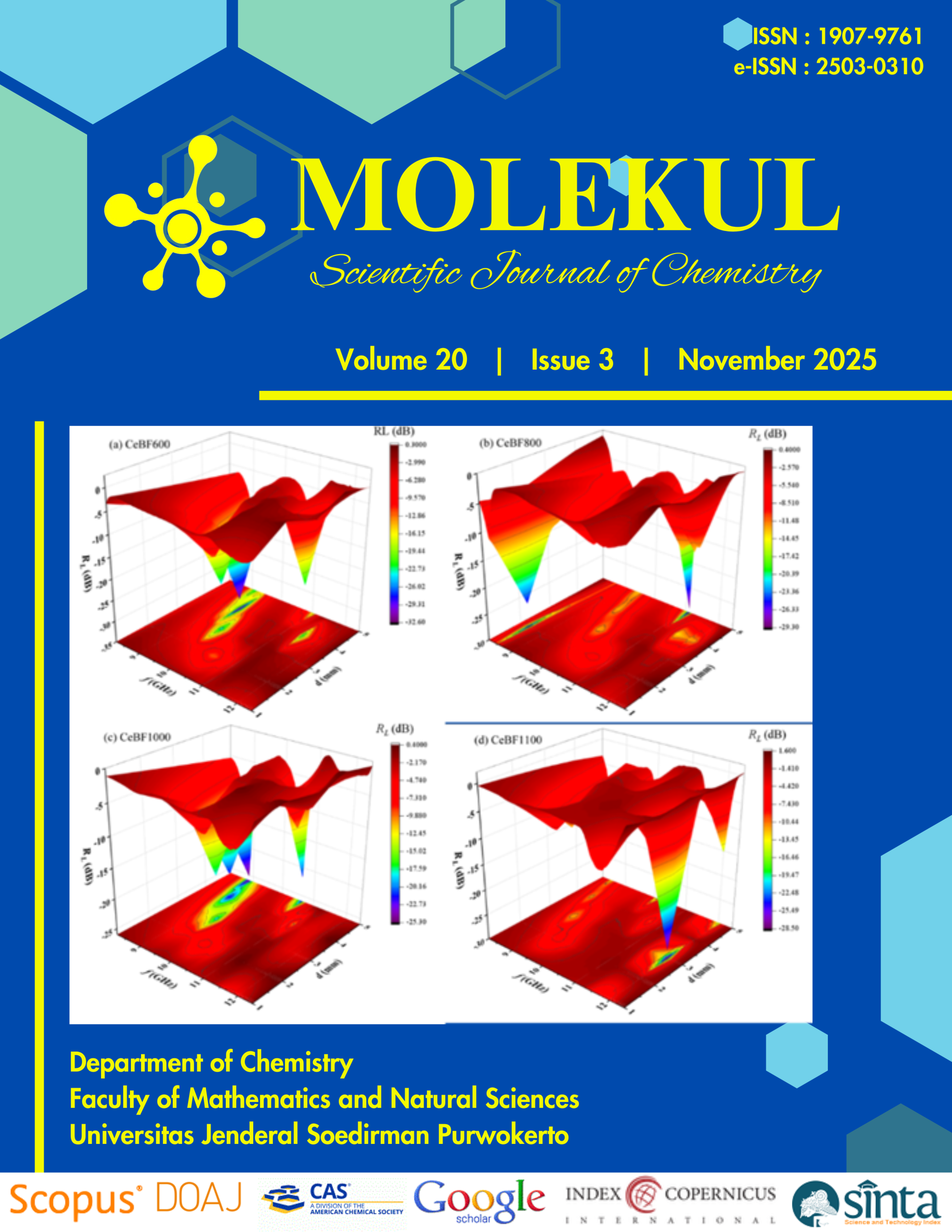 MOLEKUL is a scientific journal in chemistry publish both research and review articles, focus on the regional resources, environment or natural products of Indonesia and nearby tropical country. MOLEKUL is dedicated to fostering advancements in all branches of chemistry and its diverse sub-disciplines. It aims to publish high-quality research encompassing a wide range of topics, including but not limited to Pharmaceutical Chemistry, Biological Activities of Synthetic Drugs, Environmental Chemistry, Biochemistry, Polymer Chemistry, Petroleum Chemistry, and Agricultural Chemistry.